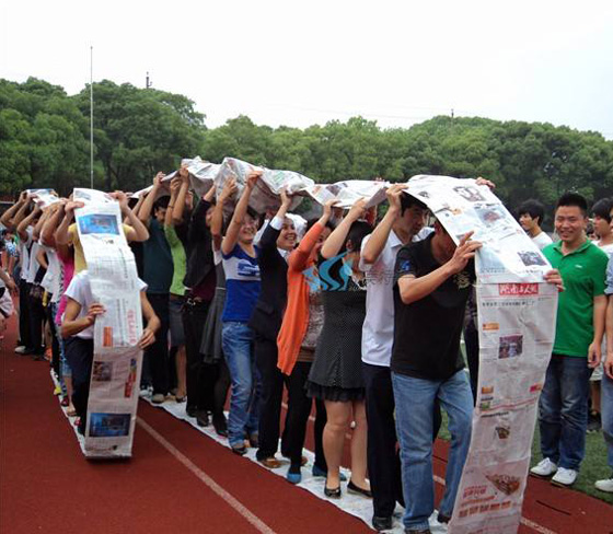 甘肃拓展项目无敌风火轮介绍:给每位队员工具,要求把报纸制造成履带式的回环,全体学员一起双脚站上,滚动前进到达目的地。